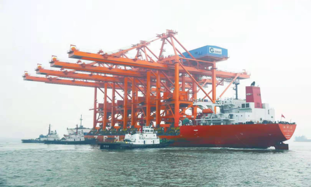 1月20日,运载4台装卸能力额定2250t/h,最大 2700t/h的桥式抓斗卸船机的“振华 32”运输船抵达防城港码头401号泊位,为防城港码头作业铁矿、煤炭货类再添新动能。它将能够满足30万吨级超大型散货船舶的卸船需求,届时401号泊位的卸船效率可达9000t/h,将有效提高港口货物通过能力。
