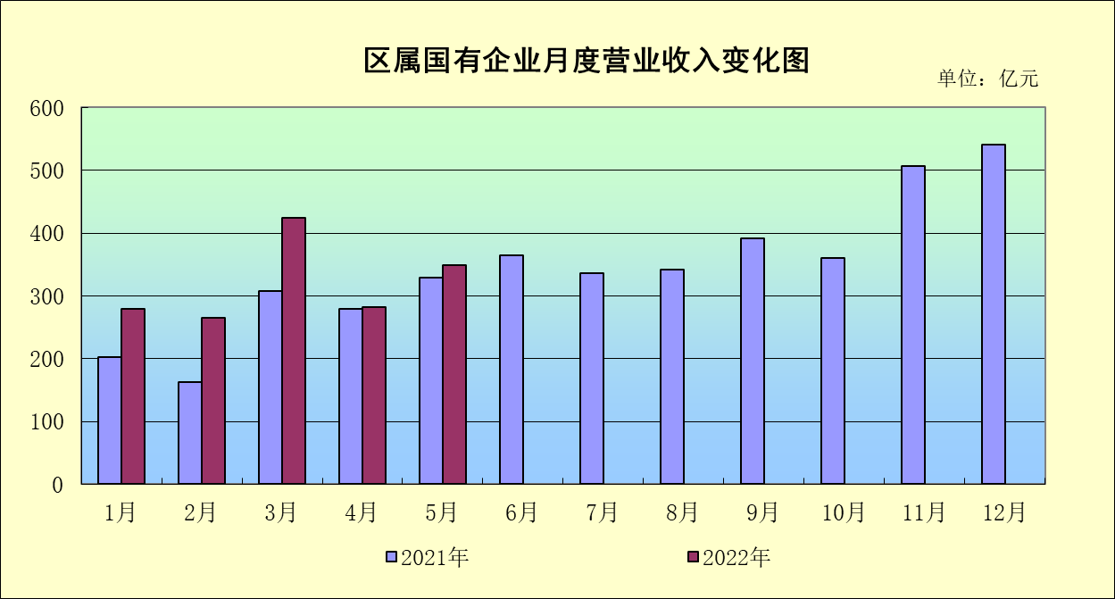 区属国有企业资产总额14731.64亿元,同比增长24.8%;净资产3676.16亿元,同比增长18.7%;1-5月累计实现营业收入1599.96亿元,同比增长25.6%;实现利润总额96.10亿元,同比增长37.3%;上交税费70.53亿元,同比增长44.3%。