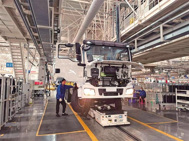 在陕汽重卡扩能基地总装厂的生产线上,工人正在装配重卡