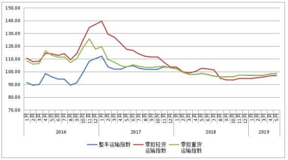 2019年5月份,由中国物流与采购联合会和林安物流集团联合调查的中国公路物流运价指数为98.2点,环比回升0.31%,连续四个月小幅回升。从月内各周指数看,除第三周环比小幅回落外,其他各周指数较为稳定,波动幅度较小。