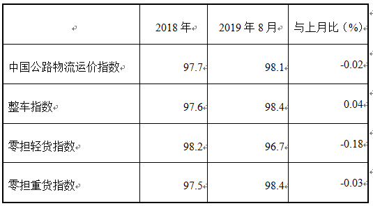 表1 2019年8月中国公路物流运价指数表