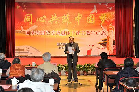 12月19日上午,管理局在国资委机关举办了国务院国资委离退休干部“同心共筑中国梦”主题宣讲会。国资委党委委员、副秘书长、管理局党委书记杜渊泉出席宣讲会并讲话。管理局领导班子成员和全系统21个单位党政主要负责同志、离退休干部、在职干部代表等180人参加了宣讲会。宣讲会上,来自各离退休干部局(办)的12位老同志以他们的亲身经历和深刻感悟阐释了他们对“中国梦”的理解和向往,表达了他们离岗不离党、退休不褪色,积极支持国资国企改革发展工作,推动科学发展,促进社会和谐的心愿和决心。大会向全委离退休老同志发出倡议——凝心聚力,共同促成民族复兴伟大中国梦的早日实现。