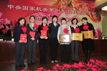 会上表彰了获得中央国家机关巾帼建功先进集体、巾帼建功先进个人、优秀妇女组织、优秀妇女工作者的单位和个人。其中,国资委改革局局长白英姿、纺织离退休干部局党委书记周佳萍获得了中央国家机关巾帼建功先进个人称号,纪委监察局、招商局(北京)有限公司被评为中央国家机关优秀妇女组织,经济出版社荣获中央国家机关巾帼建功先进集体,国资委机关妇工委委员周红勤获中央国家机关优秀妇女工作干部。