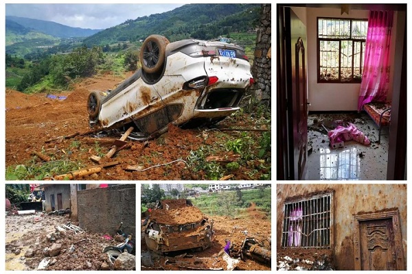 小汽车被滑坡的巨大威力掀翻、车窗被滚落的泥土砸碎、民房被掩盖……各方力量正在进行紧张救援。