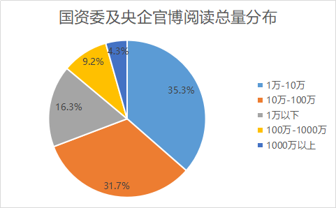 从国资委及央企官博阅读量分布中可见,总阅读量为1万-10万的账户占比35.3%,阅读量10万-100万占比为31.7%,可见可见战疫期间国资央企动态引发了大量关注。阅读量占比不足一万的占比为16.3%。
