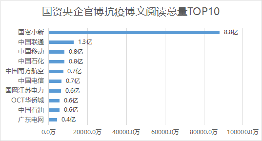 分析国资委及央企官博关于“疫情”博文阅读量TOP10,@国资小新 发博获得8.8亿的阅读量,排名第一,@中国联通、@中国移动、@中国电信 等通信类企业相关博文阅读量较多。@中国石化 发布“中石化紧急转产,建设了16条熔喷布生产线”等博文阅读量达0.8亿。@中国南方航空 发布相关航班消息及助力抗疫传播效果较好。