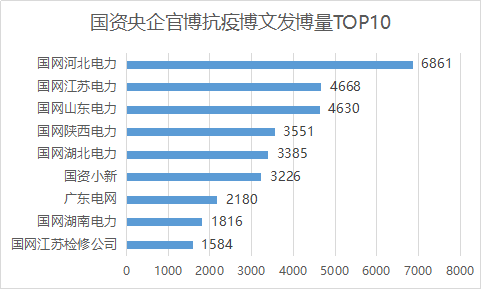 分析国资央企官博抗疫博文发博量,国家电网各省分公司官博账号最为活跃,此外,@国资小新 发博量达3226条也较为活跃。