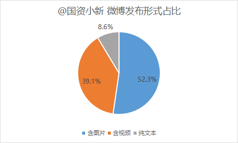 在统计时段,@国资小新 共发布6142条微博,微博原创率高达93.2%,其中含图片博文占比达52.3%,含视频博文占比达到39.1%,可见@国资小新 发布形式灵活多样,且内容生动,更能吸引受众。