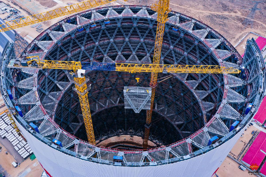 2021年1月15日,国家能源集团国电上海庙项目间接空冷系统1号冷却塔顺利结顶。该塔是全国首个采用钢结构的百万千瓦级机组冷却塔。下面来一起回顾“巨无霸”钢结构冷却塔结顶精彩瞬间。