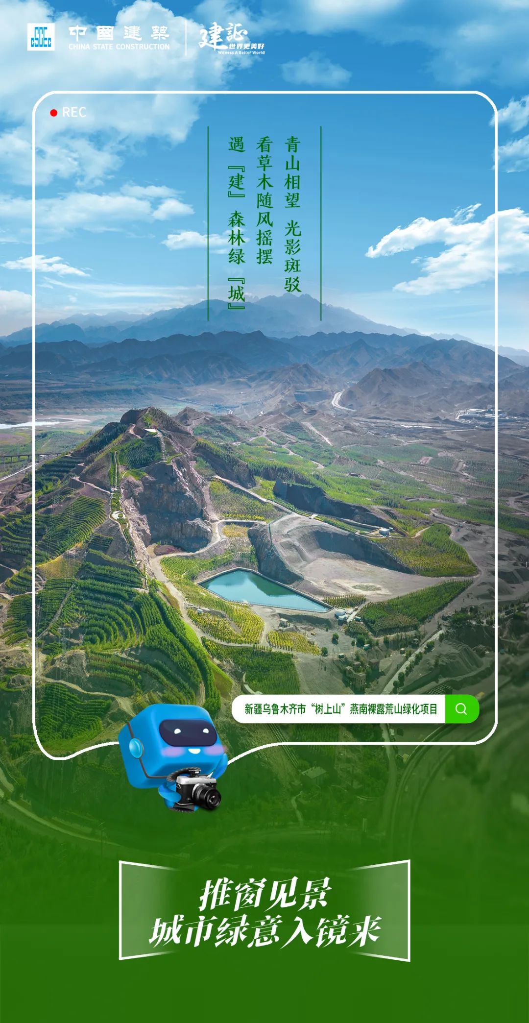 新疆乌鲁木齐“树上山”燕南裸露荒山绿化项目由中国建筑旗下中建三局、中建新疆建工承建,中建方程投资,项目是乌鲁木齐的南入口门户景观。项目运用生态自循环技术、远程端自动化灌溉的方式提高苗木生存率,涵养城市氧源和水源,成为乌鲁木齐市生态文明建设的标杆和名片。