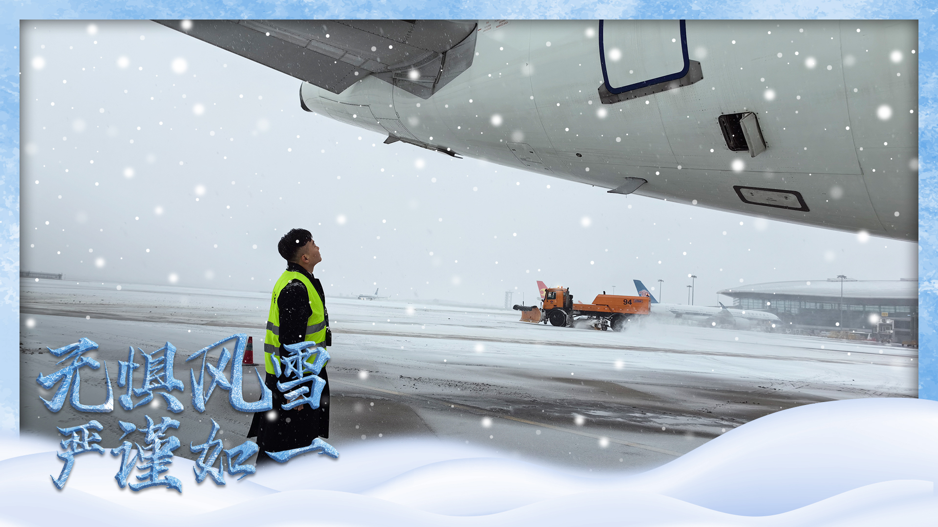 中国东航机务人员在寒风冰雪中送机,保障航班运行安全平稳。
