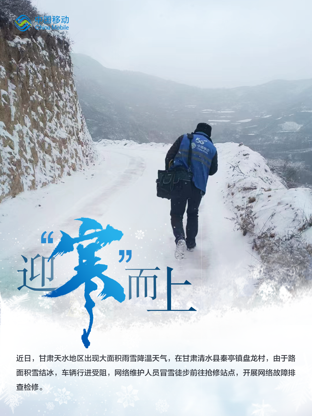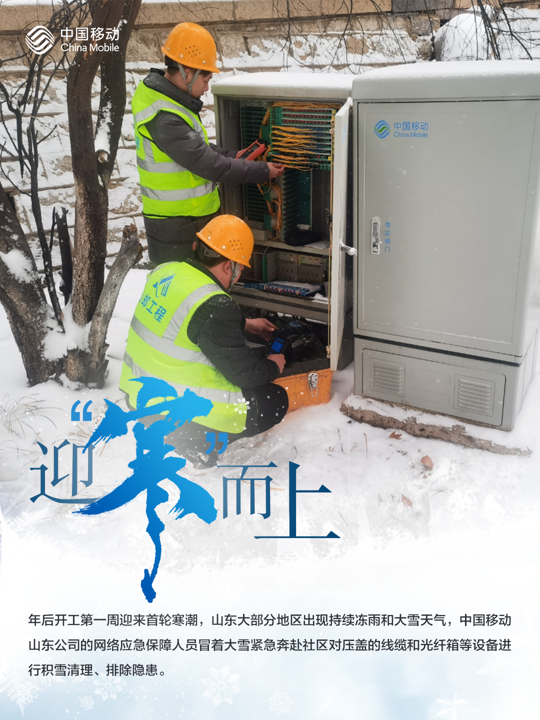 龙年首场寒潮来袭,中国移动工作人员以雪为令、迎“寒”而上,克服冰雪封路、道路受阻等困难,冒雪奔赴网络故障现场,在冰天雪地里开展基站和线路巡检,清除光缆沿线的积雪冰冻,布放熔接光缆、调试设备,全力以赴保障通信网络畅通。