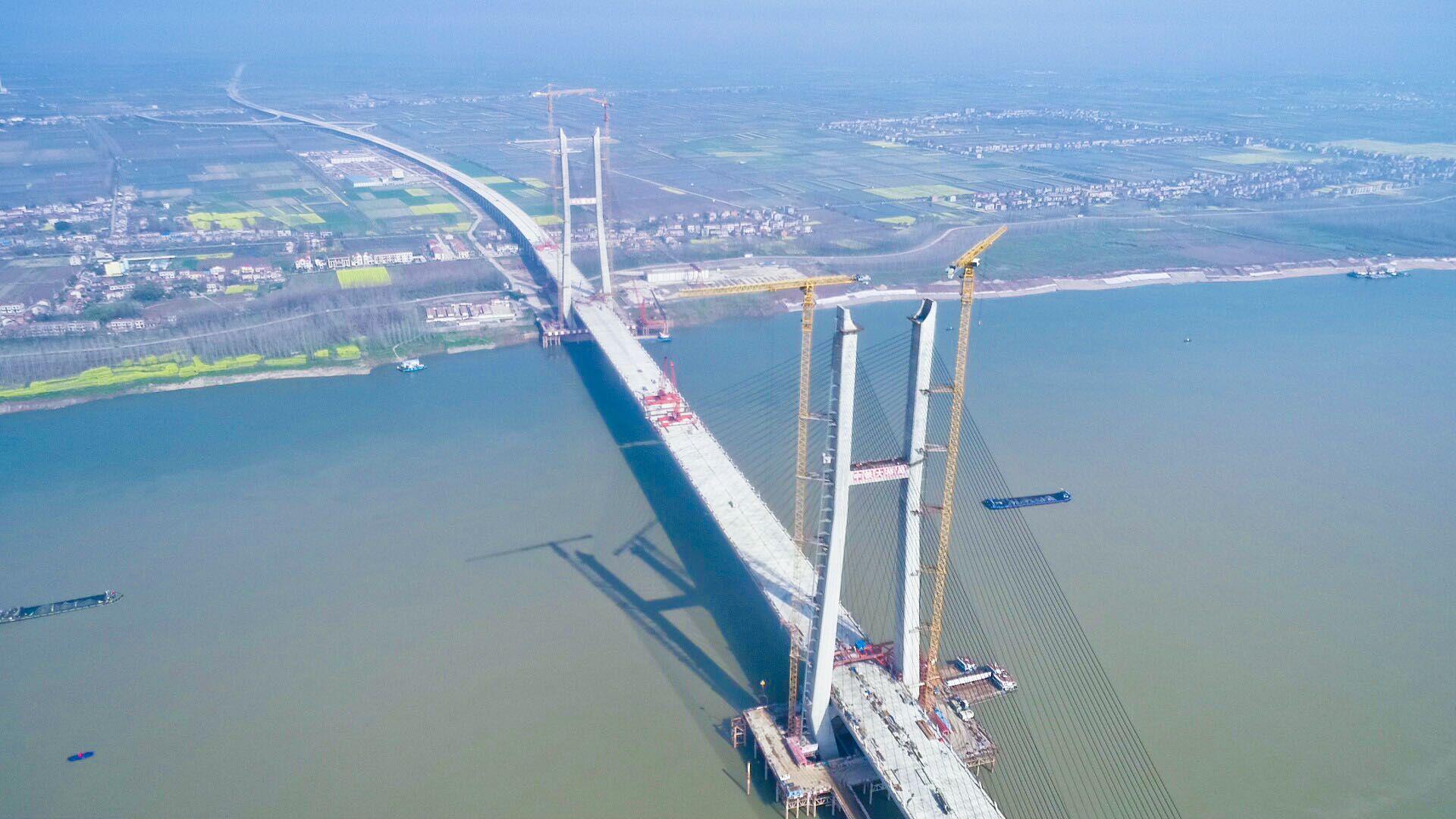 世界最大跨度三塔自锚式悬索桥山东济南凤凰黄河大桥合龙