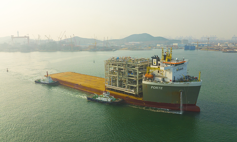 中国海油承揽的全球首例一体化建造LNG工厂首个核心工艺模块顺利启航