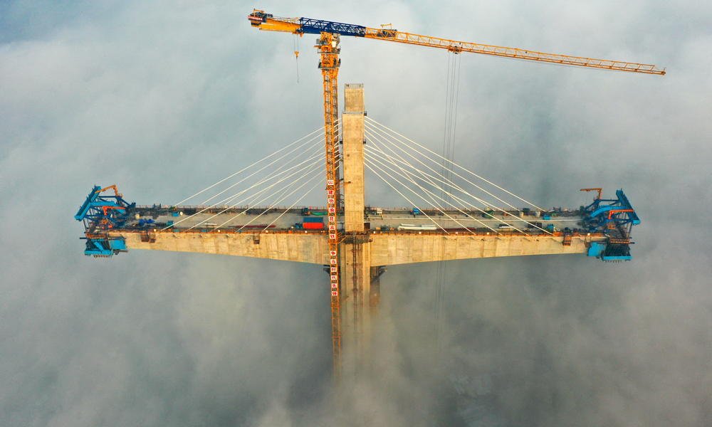 云端施工!国内首座双柱式V型桥塔高速铁路桥建设正酣