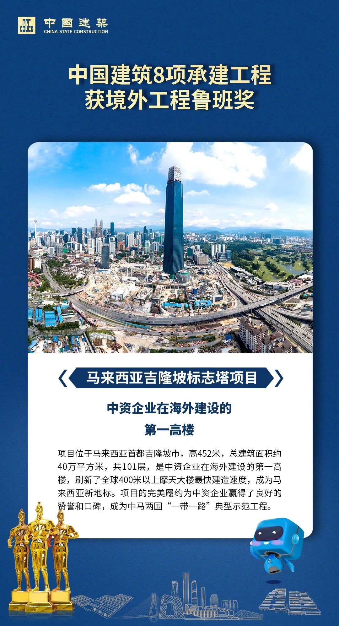 近日,中国建筑业协会公布了2020年境外工程鲁班奖评选结果。中国建筑承建的莫桑比克N6国道改扩建工程、印度尼西亚万鸦老至比通高速公路大桥、中国建筑巴基斯坦PKM项目、中国驻慕尼黑总领馆馆舍新建工程、刚果(布)国家1号公路、印象马六甲歌剧院项目、太子集团总部项目、马来西亚吉隆坡标志塔项目,中国建筑参建的赤道几内亚马拉博国家公园项目,共9项工程入选。下面一起看看今年中国建筑获奖工程风采吧!