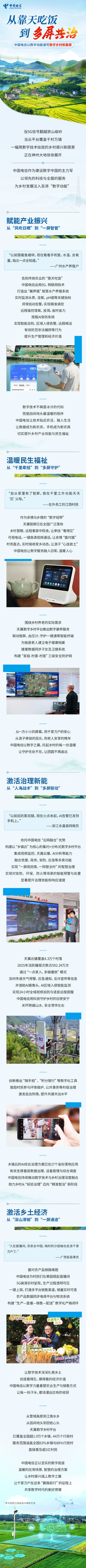 全面推进乡村振兴,数字技术大有可为。中国电信深入贯彻落实2026年中央一号文件精神,紧紧围绕乡村全面振兴总目标,在“十五五”开局之年全面发力:以数字技术赋能现代农业,发展新质生产力;以网络建设覆盖乡村,筑牢数字底座;以智能产品服务下乡,激活乡村消费,助力广大农民共享数字时代发展成果。