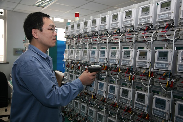 2000年,上海市电力公司员工在新的程控一体化检定台上扫描录入智能电表信息。