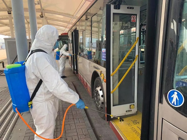 天津市公交集团切实做到运营车辆一圈一消毒、一清洁、一通风,并依据客流分布情况选取重点中途站点以每组两人负责一个站点,每天上午、下午开展专项工作。截至1月31日,已安排重点点位44个,500多人次进行了戴口罩乘车的督查和为乘客测量体温的引导。