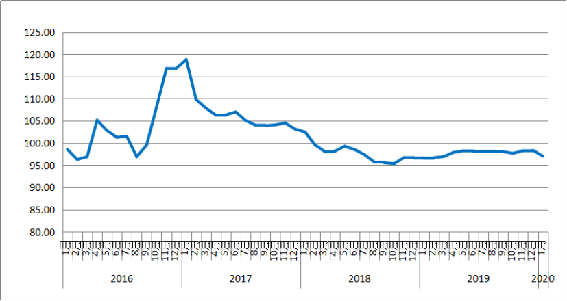 2020年1月份,由中国物流与采购联合会和林安物流集团联合调查的中国公路物流运价指数为97点,比上月回落1.33%,比去年同期增长0.5%。月内各周指数整体呈回落趋势,其中第一、三、四周环比回落,第二、五周环比回升。