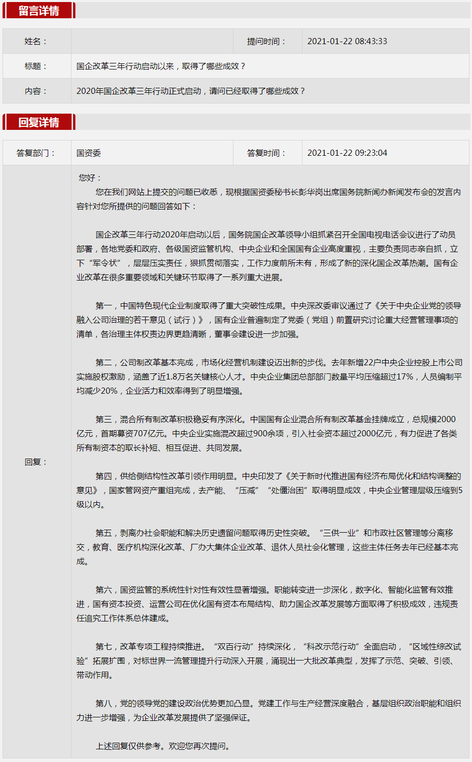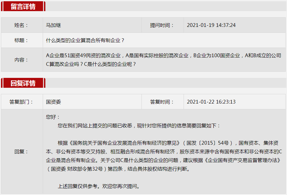 2021年1月国资委网站政务咨询栏目部分网友提出的咨询,我们初步做出了认真的回应,现选择五条关注度高、点击量高的问题,再次推荐分享。