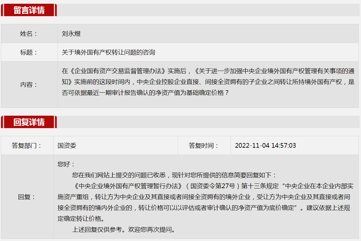 2022年11月国资委网站政务咨询栏目部分网友提出的咨询,我们初步做出了认真的回应,现选择五条关注度高、点击量高的问题,再次推荐分享。