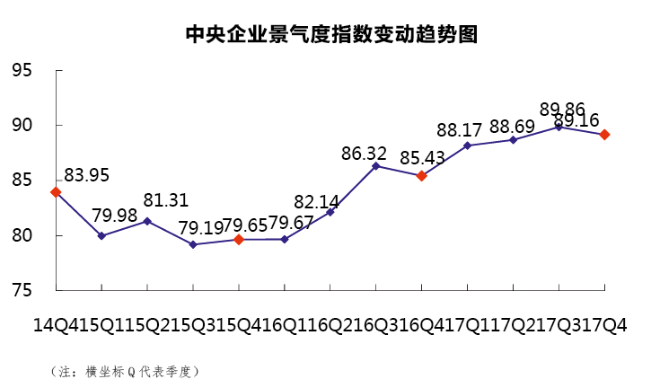 2017年中央企业景气度指数分季度依次为88.17%、88.69%、89.86%和89.16%,实现高位平稳运行。