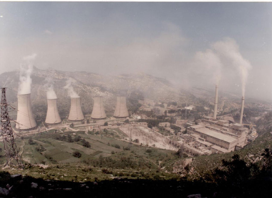 上世纪90年代初期莱芜电厂工人正在进行冷却塔内部防腐施工