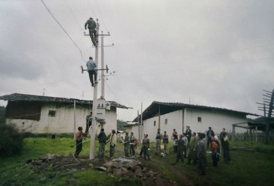 我记得电杆用的木料都是从山上用牦牛拉回来的。听技术员说安装好,就有电用,晚上也能跟白天一样亮晃晃的,我们那个激动啊,没日没夜地挖洞、拉杆,用了六天时间就把变压器架起来了。