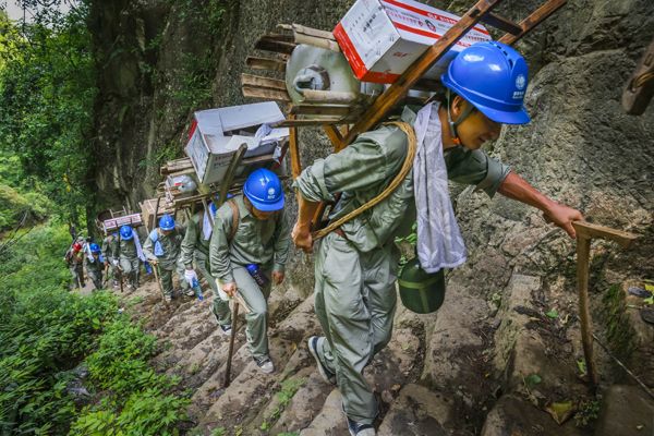 在湖北长阳县龙舟坪镇清江南岸叹气沟,供电员工背着物料,跋山涉水改造电网。叹气沟左边是高耸的将军山,右边是险要的果子岩,中间是一条常年淌着泉水的小溪。供电员工行走在其中,号子声此起彼伏,响彻叹气沟峡谷。长阳县是国家电网有限公司定点扶贫县。长阳县供电公司落实改造升级农村电网等措施,助力脱贫攻坚。李萍摄