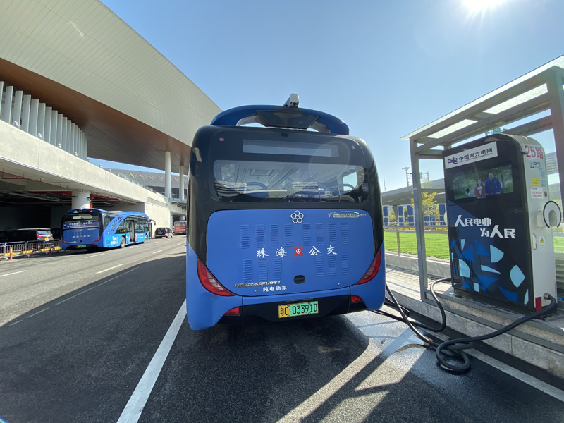 2019年12月,在珠海港珠澳大桥人工岛上,一辆辆电动公交车驶入充电区域,使用能适应港珠澳三地电动汽车的充电桩进行快速充电。林丹丹 摄