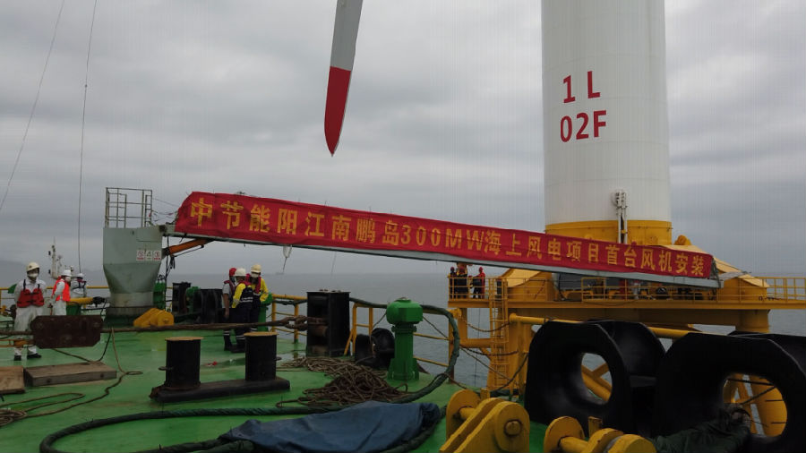 3月8日,中国节能阳江海上风电项目首台5.5MW风机,经过13多个小时的连续激战,成功将三支长达76米的叶片在100多米高空与风机机舱轮毂精准对接,首台风机吊装成功标志着中国节能风电海上项目工程建设迈出重要一步。