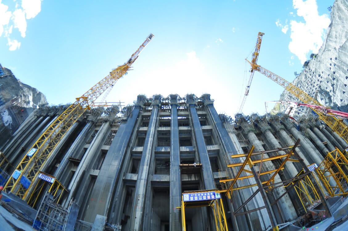 两河口水电站位于四川省甘孜州雅江县境内的雅砻江干流上,是雅砻江中、下游的“龙头”电站。进水塔由中国电建所属水电十四局、水电十六局组成的1416联合体承担施工任务,塔高115米,相当于40层楼高,塔体总宽度159.8米,顺水流方向长33米,混凝土浇筑方量达56万立方米。