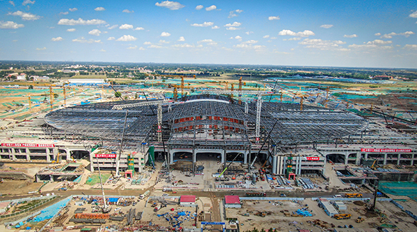 目前,京雄车场45600平方米的站台混凝土结构,18000平方米高架候车厅钢结构楼层板,606米跨度、覆盖面积12万平方米的钢结构屋盖已全部施工完成。