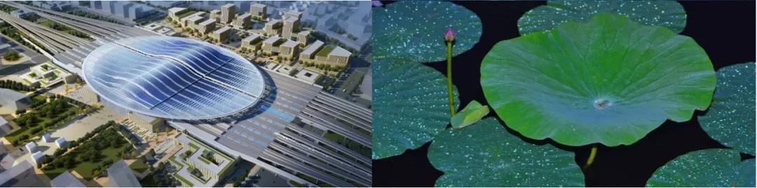 引领发展的规划理念。雄安站椭圆形屋盖形如清泉源头,温润圆满,中间结合高架候车厅自然隆起,形成三重梯度变化。椭圆形屋顶上的材质由通透的阳光板渐变为深蓝色的光伏板,如粼粼波光,晶莹闪亮,在蓝绿交织的城市组团中又似荷叶上的露珠,是依托高铁而生的新兴城市的组团之心,也是蓝绿交融的景观廊道上的生态之心。在建设伊始,站房实施方案的迅速确定,极大地推进和稳定了枢纽片区、枢纽核心区、昝岗高铁片区的规划设计,使车站建设引领城市发展的最初规划构想得以实现。