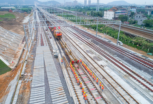 6月22日上午,在浙江省台州市温岭市杭(州)绍(兴)台(州)铁路终点温岭站施工现场,随着中国铁建中铁十一局集团施工人员将最后一对长钢轨顺利铺设到接轨点,精准落位,标志着我国首条民营控股的高铁——杭绍台铁路全线铺轨贯通,为年底全线开通运营奠定了坚实基础。