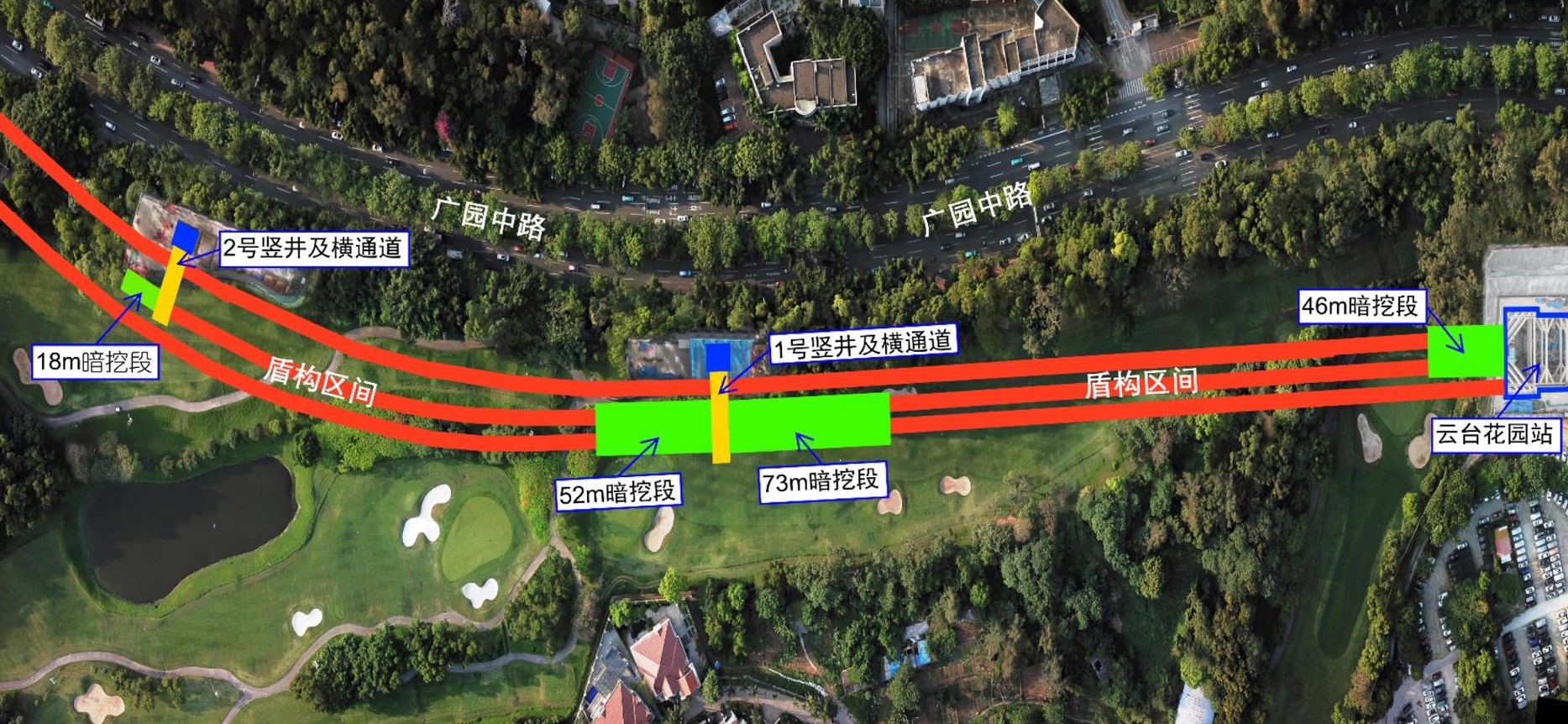 广州云大区间隧道暗挖工程位于麓湖高尔夫球场内并紧沿广园快速主干道敷设,周边环境复杂敏感,隧道洞身围岩以混合花岗岩风化残积土层为主(含砂量50%),综合围岩级别为VI级,暗挖风险极大,暗挖主隧道具有埋深浅、暗挖断面超大的特点,采用传统的围岩加固方法难以保证浅埋暗挖施工的安全要求。