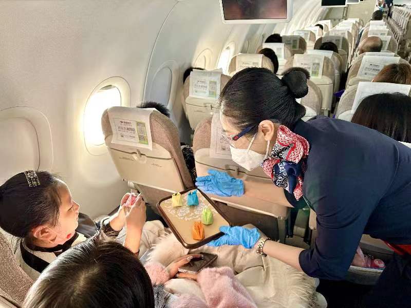 春节长假期间,东航特色服务从空中到地面营造浓浓“年味儿”。东航MU5973/4昆明—芒市—昆明民族特色航班于春节期间首航,这是目前全国第一个民族特色航班。航班服务融合傣族、景颇族民族元素,结合云南边境异域风情,让旅客在乘机过程中体验眼睛可看、耳朵可听、手感可触、味觉可尝的云南民族特色。