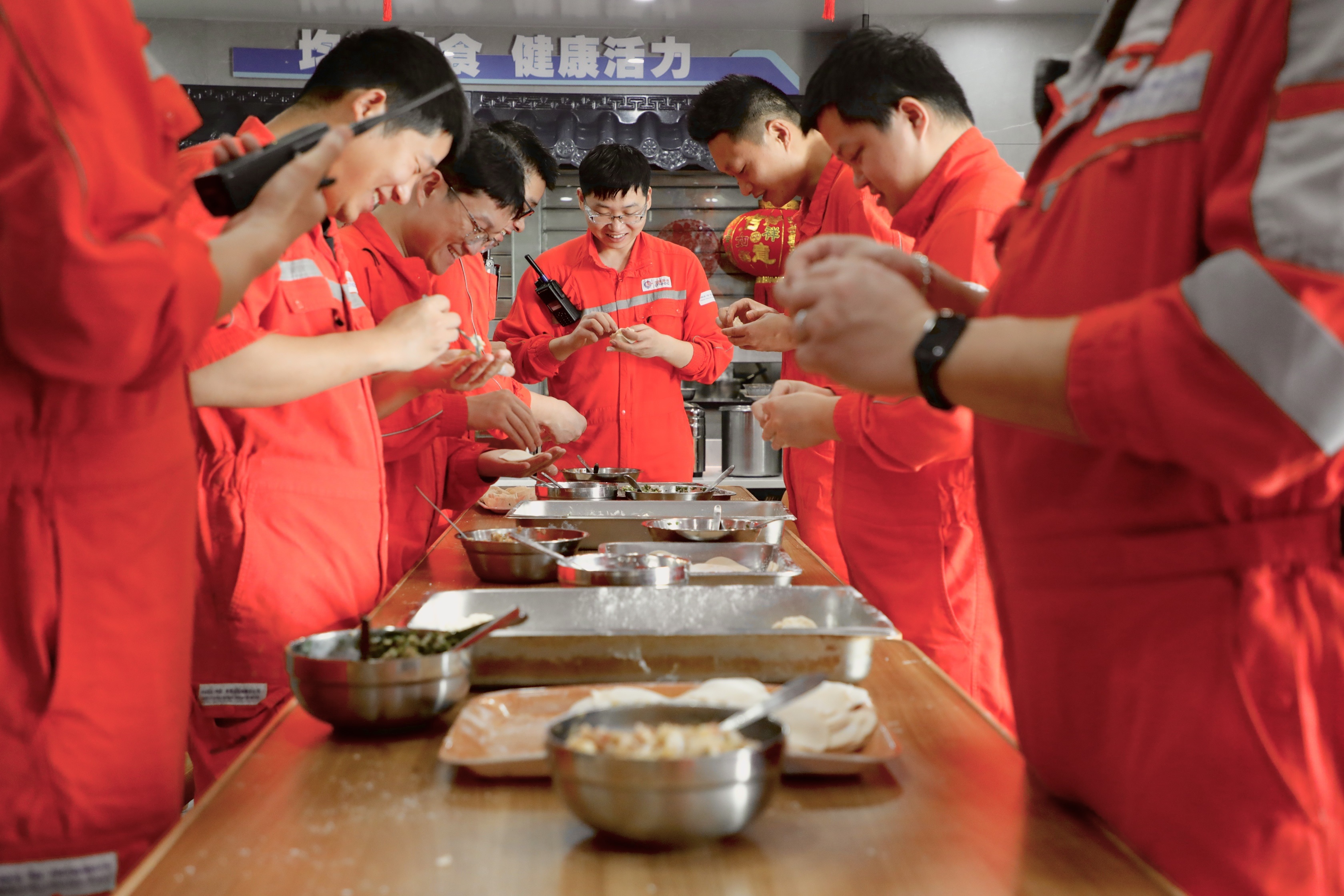 1月23日,农历正月初二,“深海一号”超深水大气田员工在包饺子迎新春。