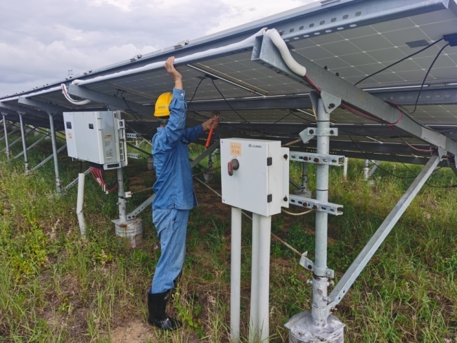 台风登陆前,位于海南的华能东方光伏电站运维人员正在检查光伏组件固定是否牢靠。