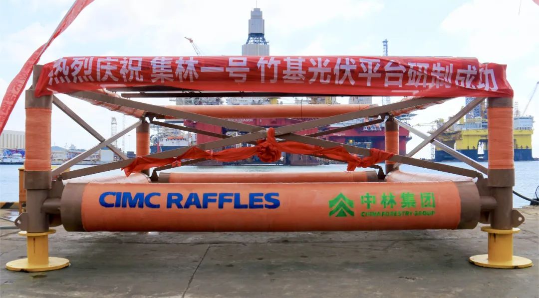 “集林一号”竹基海上光伏平台长7米,宽7米,高2.4米,总重约4吨,由中林集团和中集来福士集团研发团队共同研发建造,历经材料创新、试制检验和安装调试三个阶段,属国内首次采用质轻高强的竹基海工材料为主材,“以竹代钢”搭建的海上光伏平台。