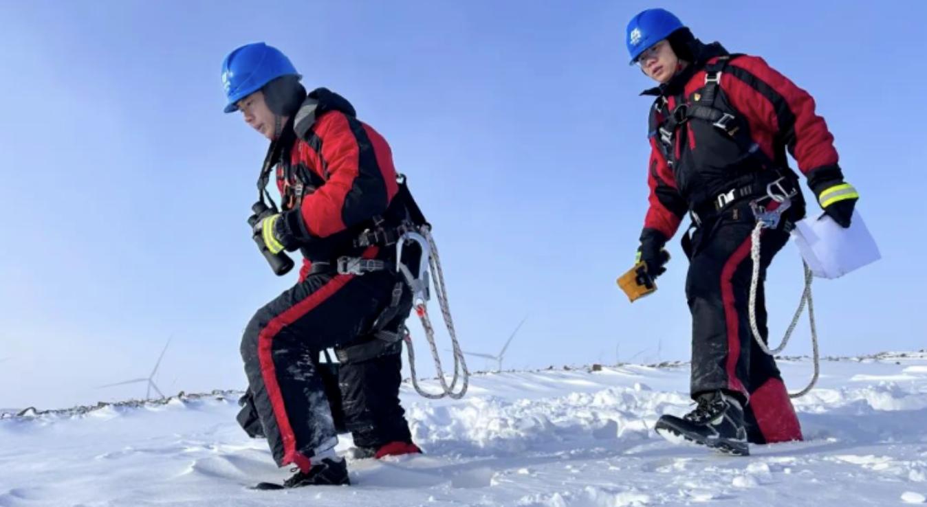 在山西,中国华电山西公司组织点检员在雪后开展风机和集电线路巡检工作。点检员在零下十几度的刺骨寒风中踩着30厘米深的积雪,连续3天徒步行走50余公里,累计排查72基铁塔,确保第一时间掌握设备情况,全力抗击冰雪挑战。
