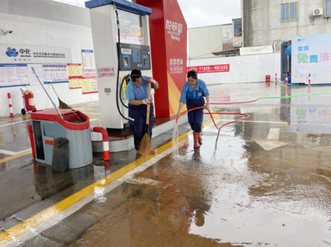 面对福建多地强降雨侵袭,中化福建石油龙岩和惠安等地加油站员工全面排查油机及油罐区风险隐患,维护油站安全稳定。洪水退去后,员工们迅速清理淤泥,加快恢复油站正常运营。