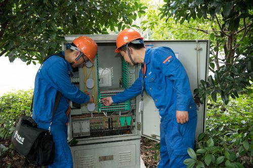 中国电信施工人员在布放场馆内WiFi设备接入线路