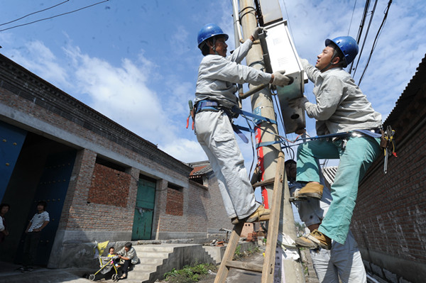 北京昌平供电公司员工在十三陵镇康陵村进行“煤改电”施工