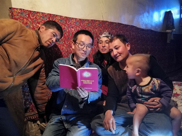 驻村工作队队员向结亲户宣传党的十九大精神。