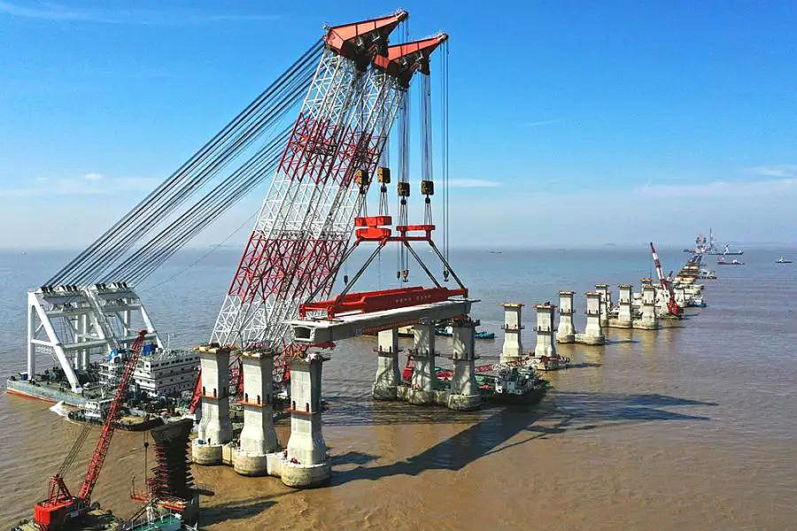 4月18日,一榀长69米、宽12.55米、重达1800余吨的预制箱梁,被四航奋进号2600吨起重船缓缓提起,安全、精准地落至宁波舟山港主通道舟岱跨海大桥NZ24号和NZ25号墩上。至此,浙江省交通集团成功完成首榀全国最重最长跨海大桥预制箱梁架设。