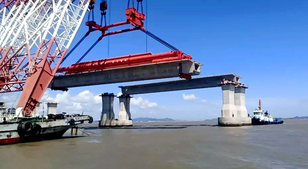 近日,随着“奋进号”起重船起吊提梁,宁波舟山港主通道舟岱跨海大桥非通航孔70米箱梁第100片架设完成。