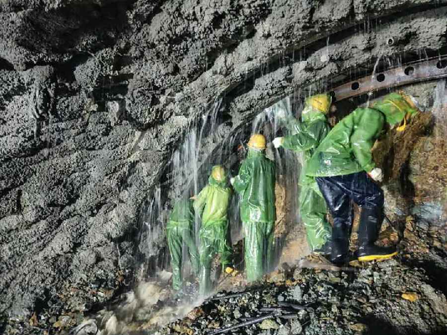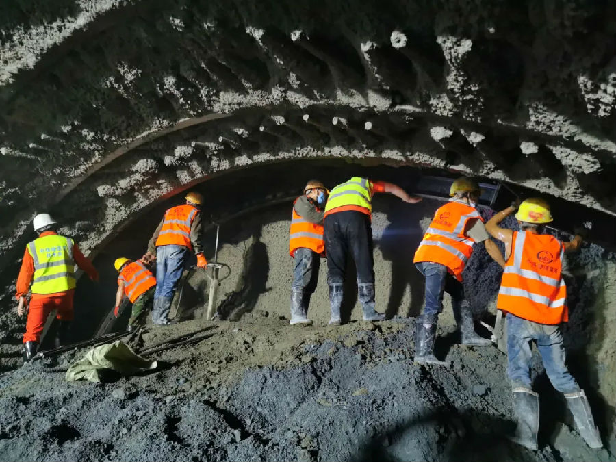 新平隧道是全线的“卡脖子”工程,这座隧道的安全按期贯通不仅为全线化解安全风险,也为后续桥梁架设、轨道铺设创造条件,为全线按期建成通车提供保障。新平隧道位于云南省玉溪市新平县,全长14.8公里,属单洞双线隧道。该隧道从两大断裂带间通过,共穿越7条断层破碎带,围岩极其松散、破碎、富水,溜坍、软岩大变形以及突泥涌水频发,地质条件极为复杂、安全风险极高、施工难度极大,是全线的“咽喉”工程。因施工难度大,安全风险高,2016年6月开工建设以来,每向前掘进1米,建设者们都要付出艰辛的努力,施工中极易涌水、涌砂,新平隧道的砂比芝麻粥还细,含水量最高达28%,就跟水豆腐一样。建设者们形容隧道的建设是在“水豆腐”中打洞。为破解施工难题,铁路部门和施工单位组织专家组进驻现场,根据现场实际进行动态设计,采取长隧短打策略,全隧开设13个辅助坑道,最多时29个作业面同时施工。