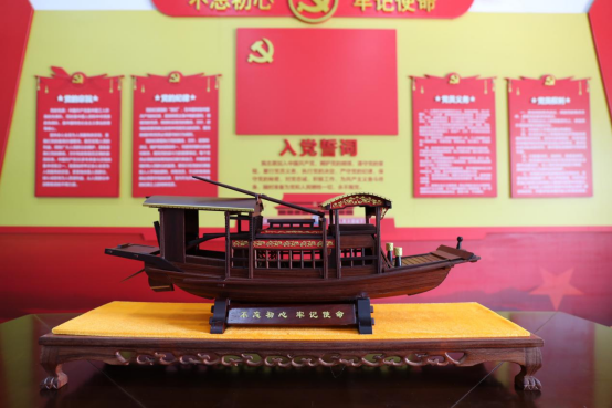 华灯初上,恢宏的红色空中廊桥蜿蜒在嘉兴西南湖,围成一颗“红心”,又神似即将起航的红色巨轮,格外引人瞩目。